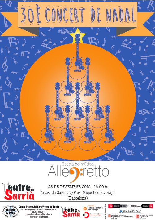 Ens complau convidar-vos a tots aquest dimecres al concert de Nadal de l’Escola de música Allegretto! Serà al Teatre de Sarrià a les 18 h. Passeu-hi i gaudiu de la magnífica música de tots els nostres alumnes! Bon cap de setmana i molta música!